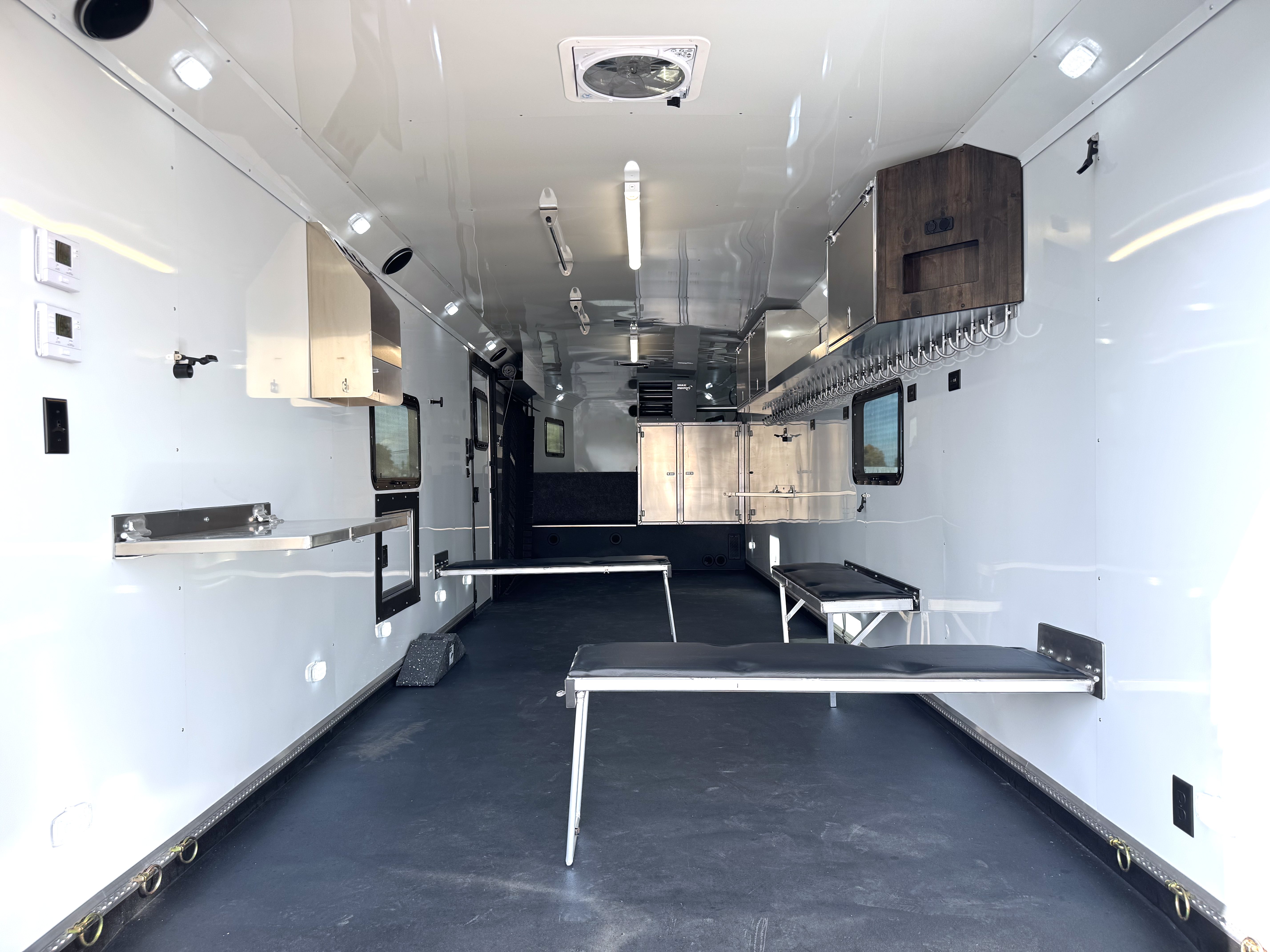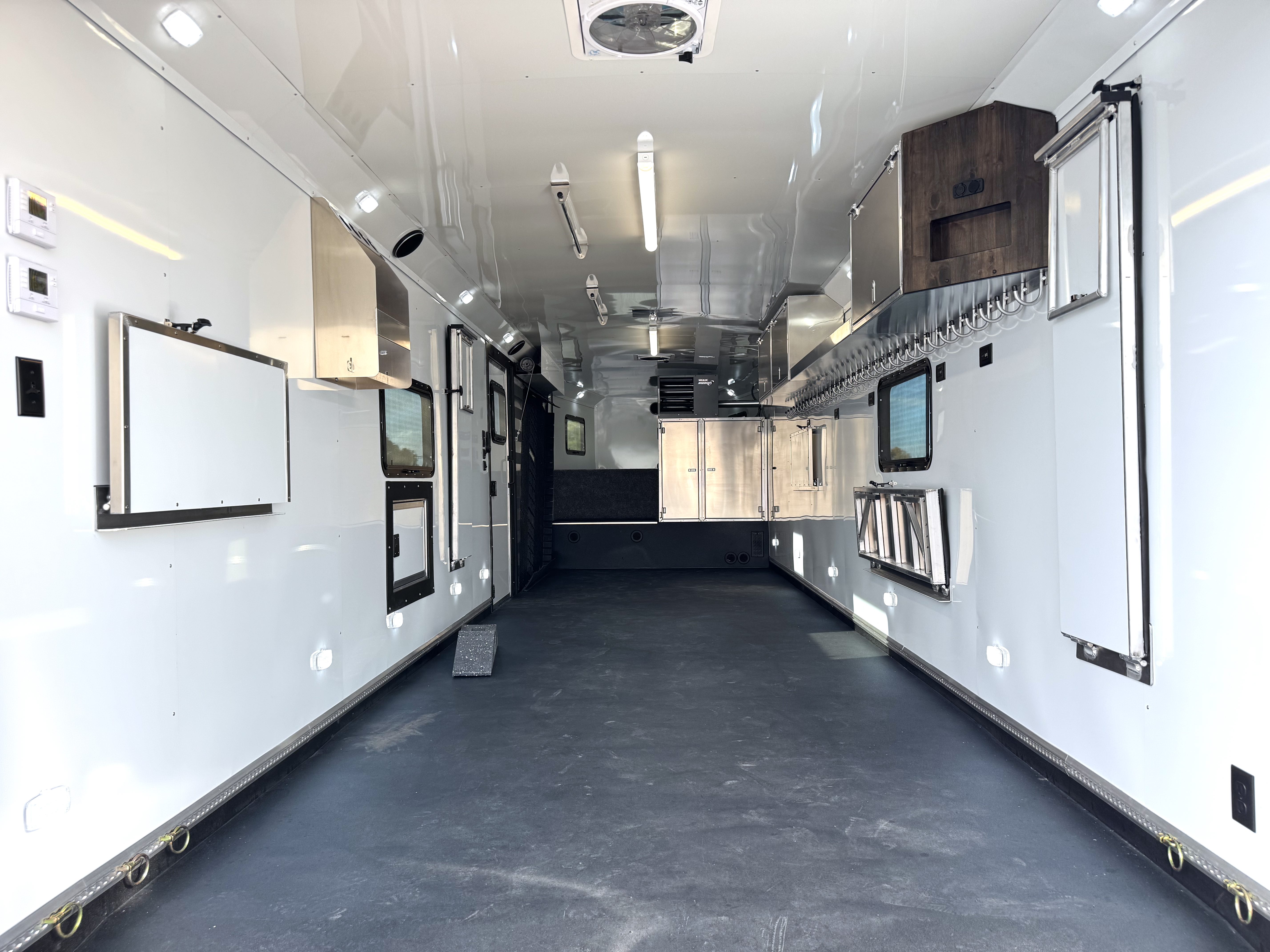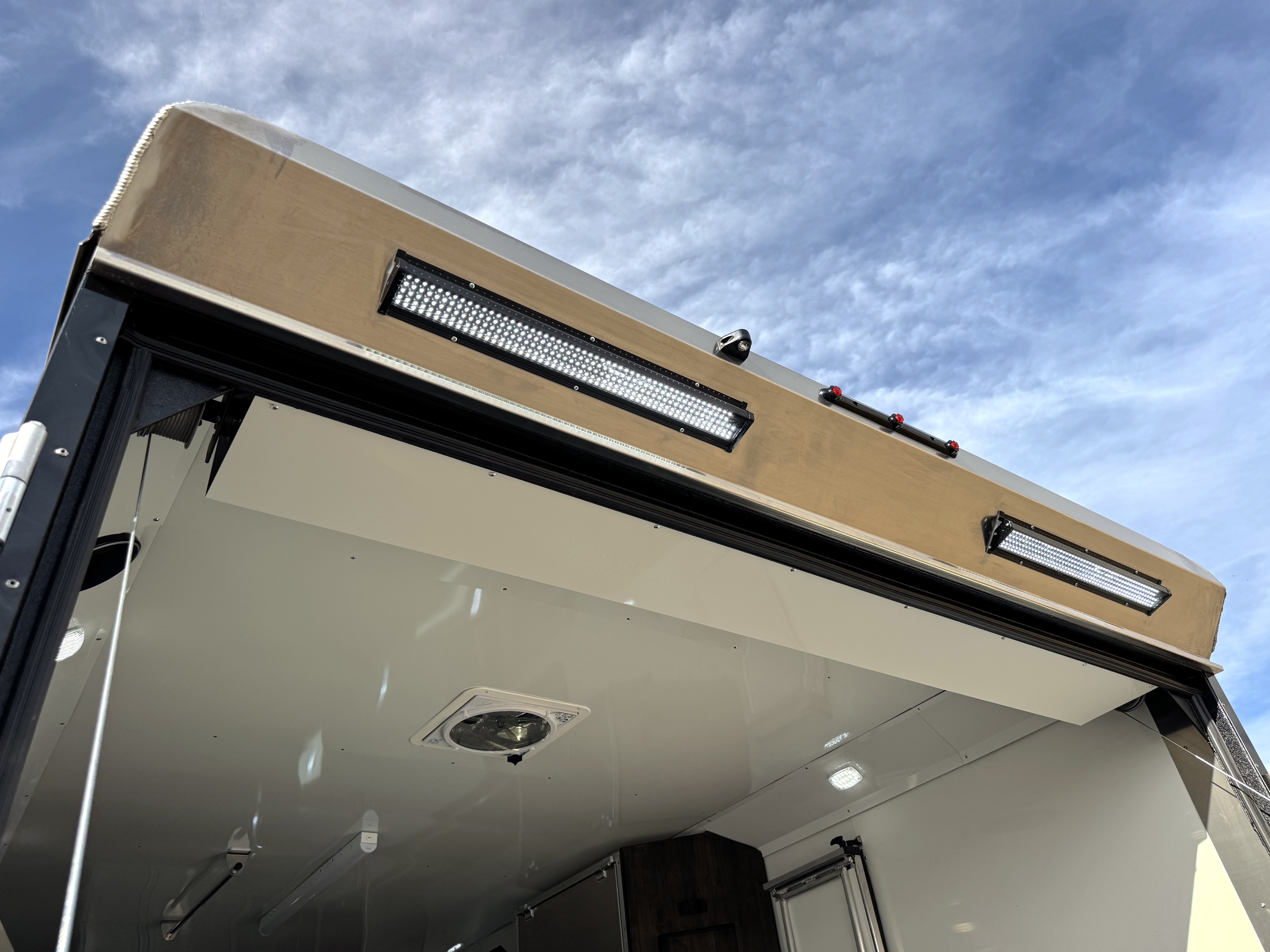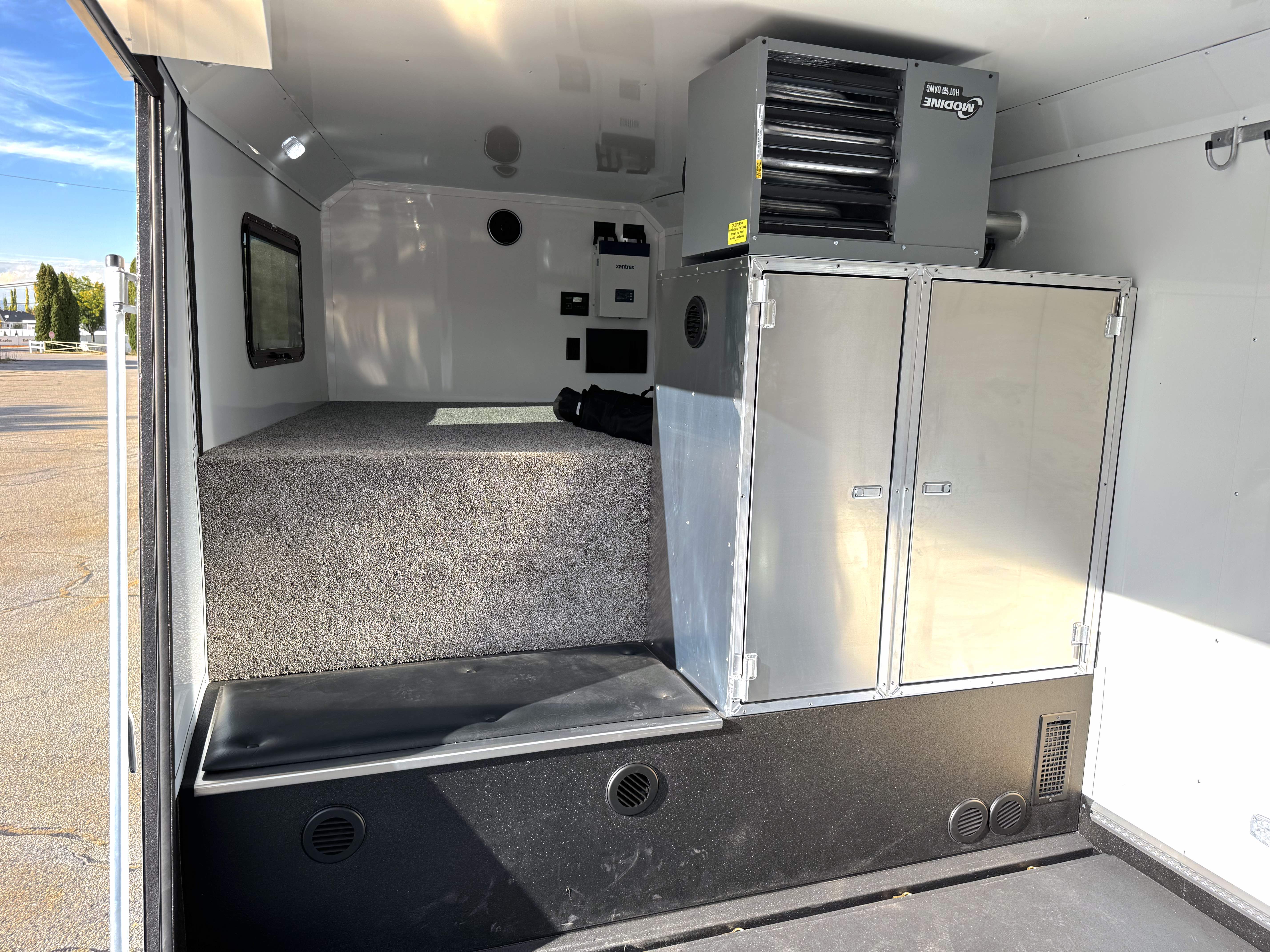 The Goose Neck Horse Power model was designed and built with input from world-class riders to create a high-end motorsports trailer, ensuring you and your gear stay warm and dry while traveling in comfort and style. Chris Burandt, an innovator and leader in the Freestyle Snowmobile community, has enhanced our best motorsports trailer with incredible features perfect for your weekend adventures. The Chris Burandt Backcountry Package includes all the features of the Zbroz Edition Horse Power trailer, plus these additional, hand-picked features from Chris: Additional Lighting: Four extra marker lights (top & bottom), flush-mounted mid-level garage lights on walls, two LED strip lights in the center of the ceiling, and 24" scene lights (in lieu of porch lights). Interior: An extra horizontal bench under the cabinet, a 33" cabinet on the front passenger side (in lieu of a man door), a shelf under the gooseneck and in the BP garage, an extra floor drain at the front, a second fold-down workbench at the front, 12 extra coat hooks, two mono suit holders, and an oil caddy cabinet. Electrical: A 190-watt Solar Package, six 12V plugs above the coat hooks for avalanche bags, and a shore power plug at the front under the gooseneck or at the front of the BP. Entertainment: A touch screen stereo system. Exterior: Two-tone skins and a keyless combination door lock. Graphics: The exclusive Chris Burandt Backcountry graphic package.
